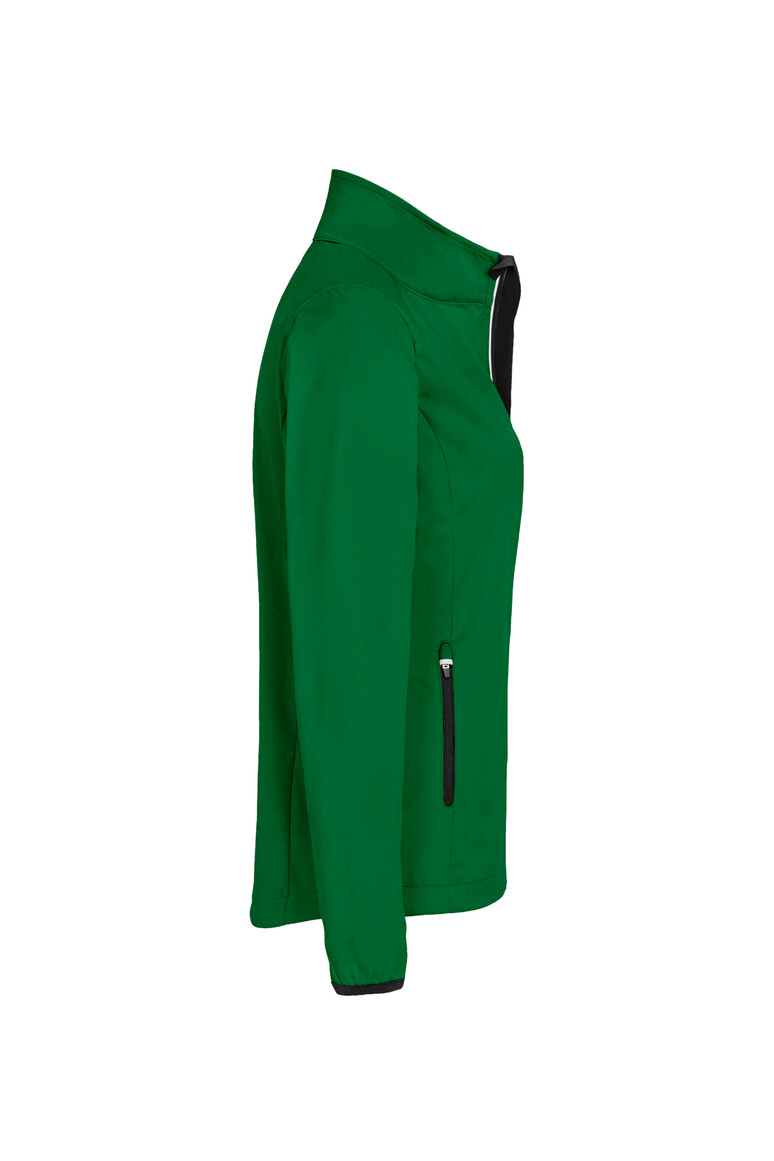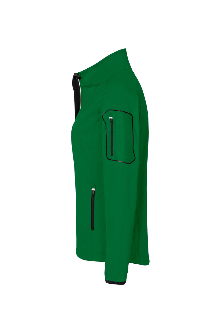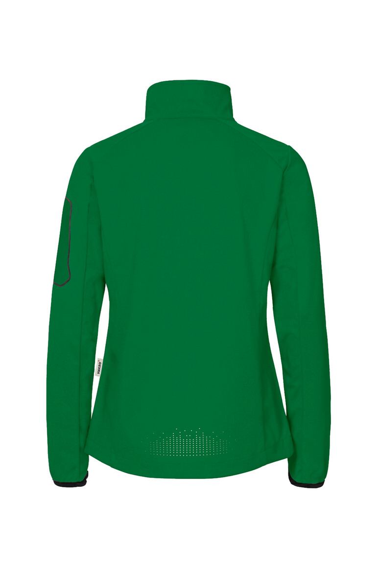 Leichte, atmungsaktive, strapazierfähige Softshelljacke für Damen, mit wasser- und winddichtem Softshellobermaterial, Teilungsnähten auf Vorder- und Rückenteil für perfekte Passform, elastischen Ärmelbündchen mit Daumenschlaufe, verschweißter Reißverschlusstasche am linken Ärmel und seitlichen Reißverschlusstaschen mit Reflexapplikation, hochwertigem Zwei-Wege-Frontreißverschluss mit innenliegender Windschutzpatte, Reißverschlussgarage und Reflexpaspel, reflektierender Druckgrafik am verlängerten, abgerundeten Rückenteil, weitenverstellbarem Saumabschluss mit Tunnelkordelzug und Stoppern. Alle Click-down-Reißverschlüsse von YKK®. Hergestellt aus leichtem, dehnfähigem Softshell-Material für exzellente Bewegungsfreiheit aus Interlock-2-Lagen-Laminat mit TRIACTIVE PRO Technologie. Gedrucktes HAKRO Necklabel für höchsten Tragekomfort und gewebtes HAKRO Flaglabel an der linken Seitennaht.