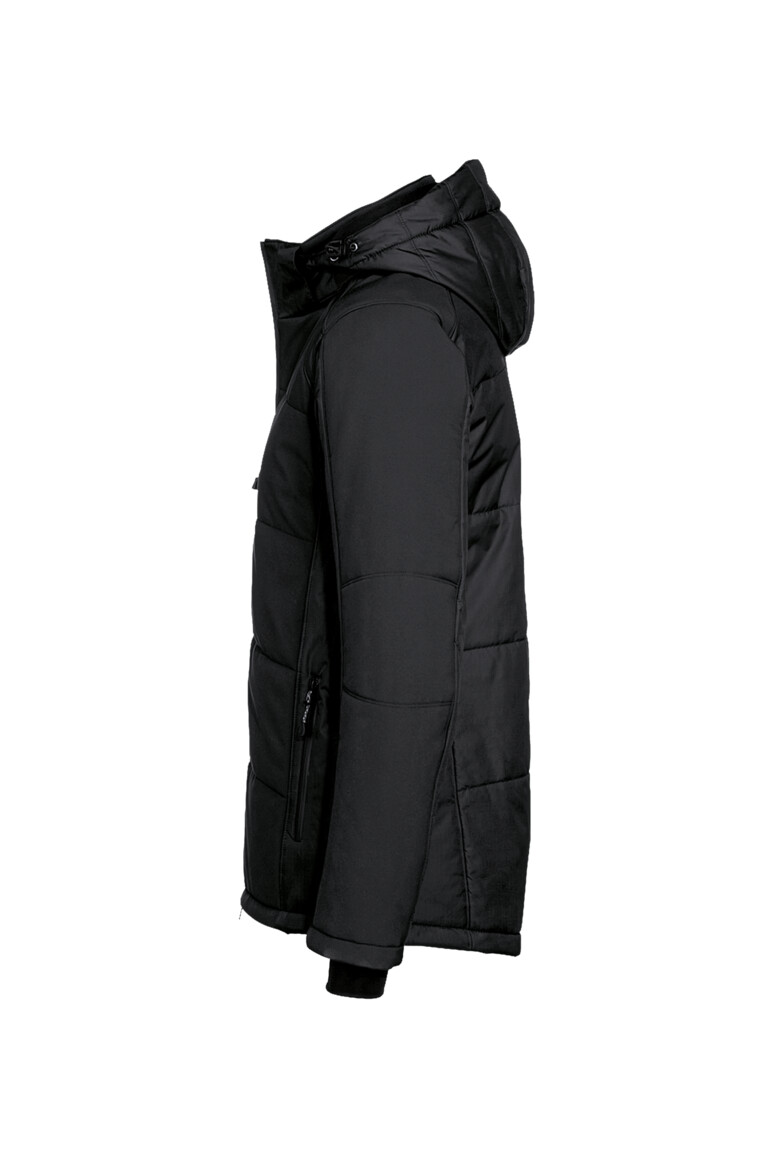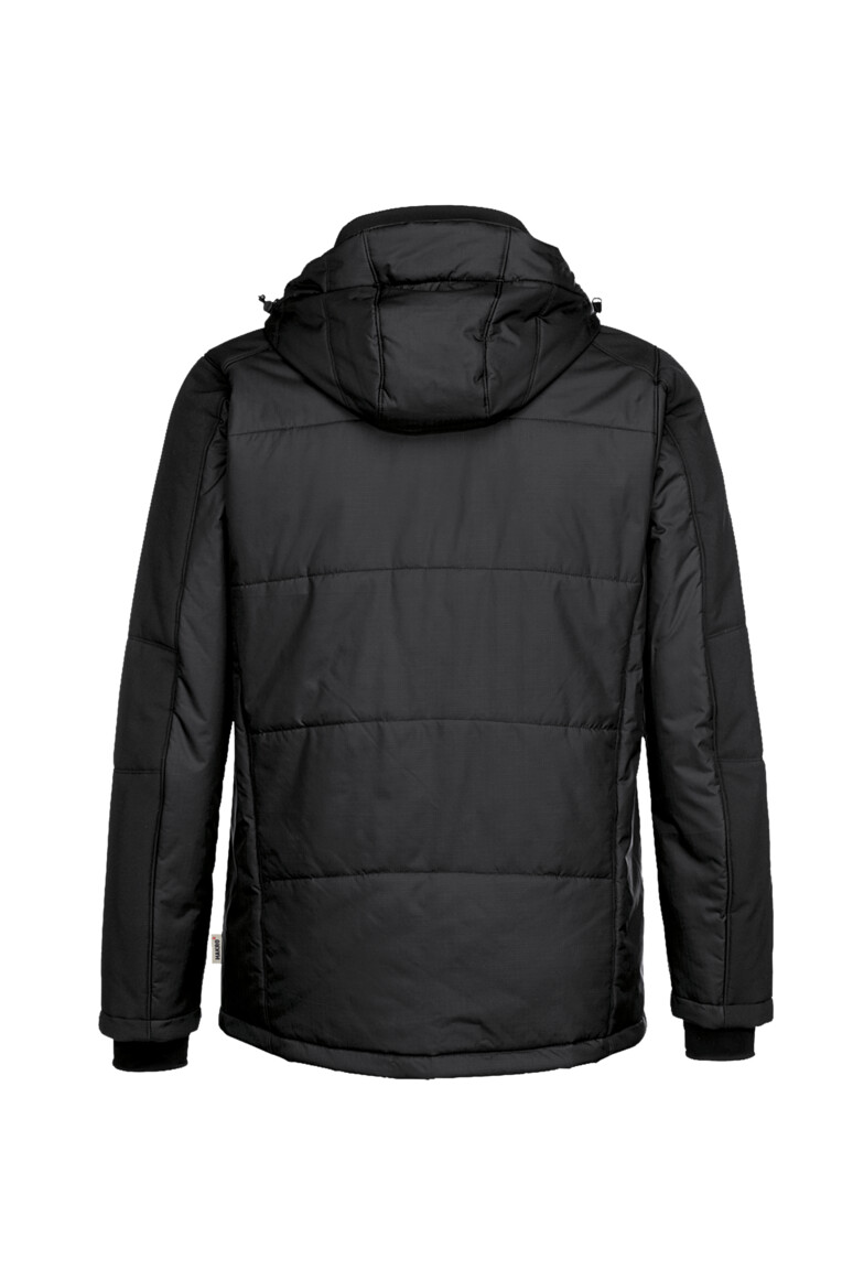 Wärmende, funktionelle und wasserdichte Heavy-Softshelljacke mit dicker Wattierung, verlängertem, abgerundetem Rückenteil, weitenverstellbarem Saumabschluss, Tunnelkordelzug und Stoppern. Weiches Fleece-Innenfutter für optimale Wärmeisolation und Wärmerückhalt. Mit abnehmbarer, gefütterter Kapuze, hochwertigem Zwei-Wege-Frontreißverschluss mit Windschutzpatte und Reißverschlussgarage. Funktionelle Innentasche und seitliche Einschubtaschen mit Reißverschluss. Alle Reißverschlüsse von YKK®. Ärmelabschlüsse mit zusätzlichen elastischen Schlauchbündchen mit Daumenschlaufe und Reflexapplikationen für verbesserte Sichtbarkeit. Hergestellt aus TRIACTIVE PRO, einem strapazierfähigem Ripstop-Gewebe und dehnfähigem Softshell-Material. Gewebtes HAKRO Necklabel aus hochwertigem Kettsatin mit weichen, ultraschallgeschnittenen Bandkanten für höchsten Tragekomfort und gewebtes HAKRO Flaglabel an der linken Seitennaht.
